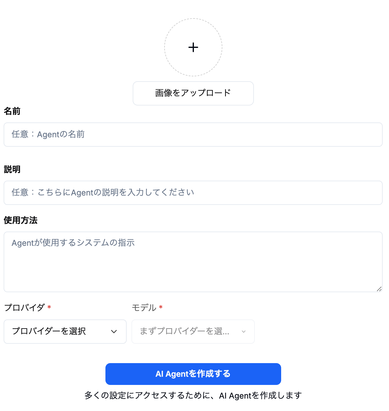 **ご注意:** 追加の設定項目にアクセスするには、必ず**AI Agent を作成する**をクリックしてください。