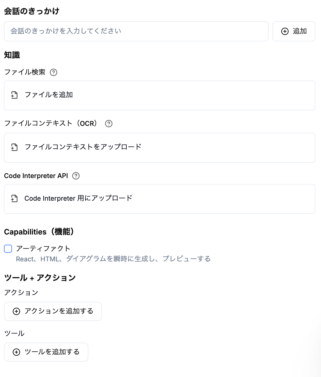 * **詳細設定**：会話のきっかけ、ナレッジ、Code Interpreter API、ケイパビリティ、ツール＋アクション
